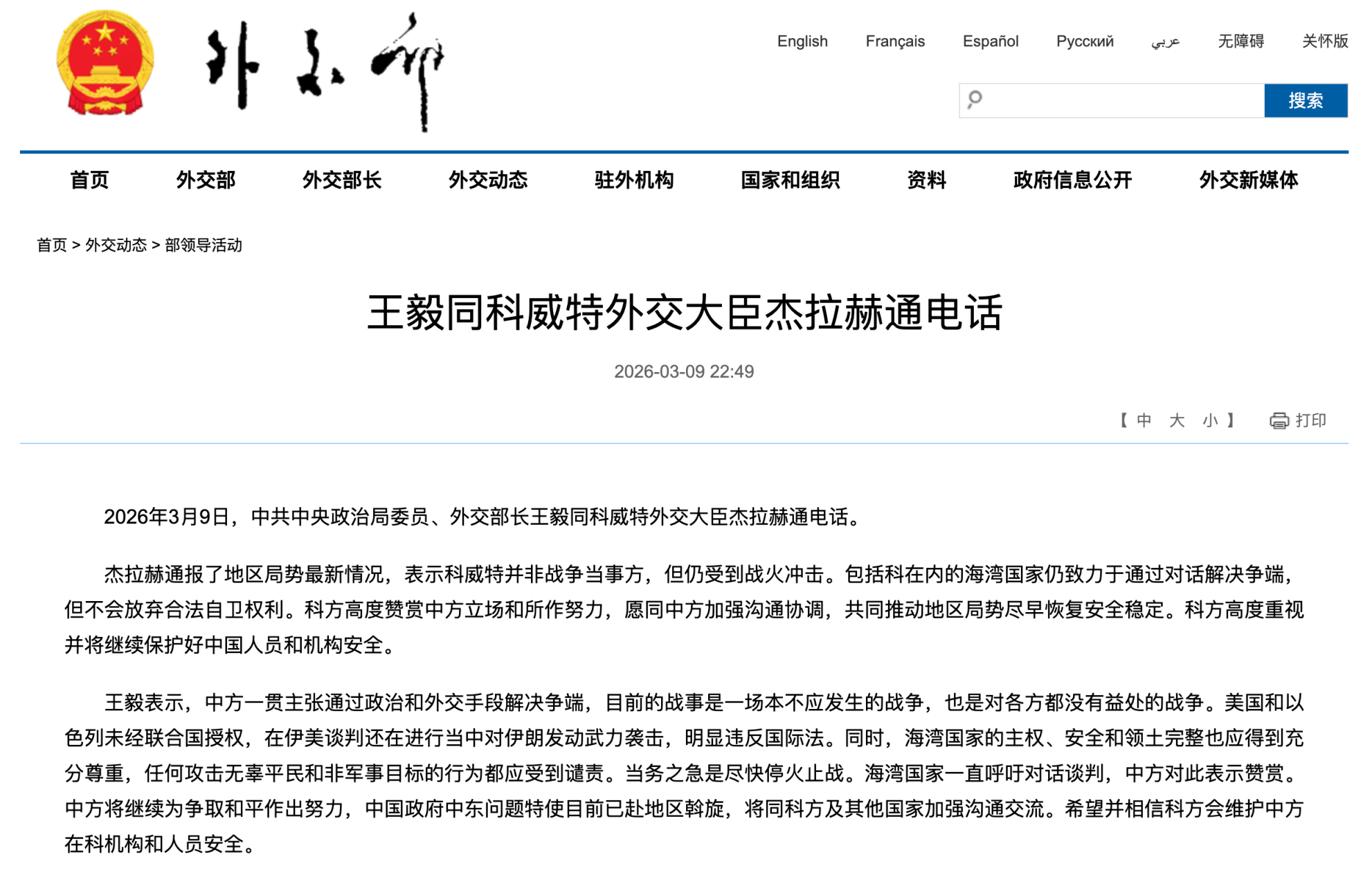 据外交部网站消息,3月9日,中共中央政治局委员、外交部长王毅同科威特外交大臣杰拉赫通电话。